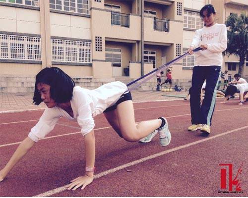 圖一、田徑隊爬行訓練,後方以強力帶增加向前的阻力