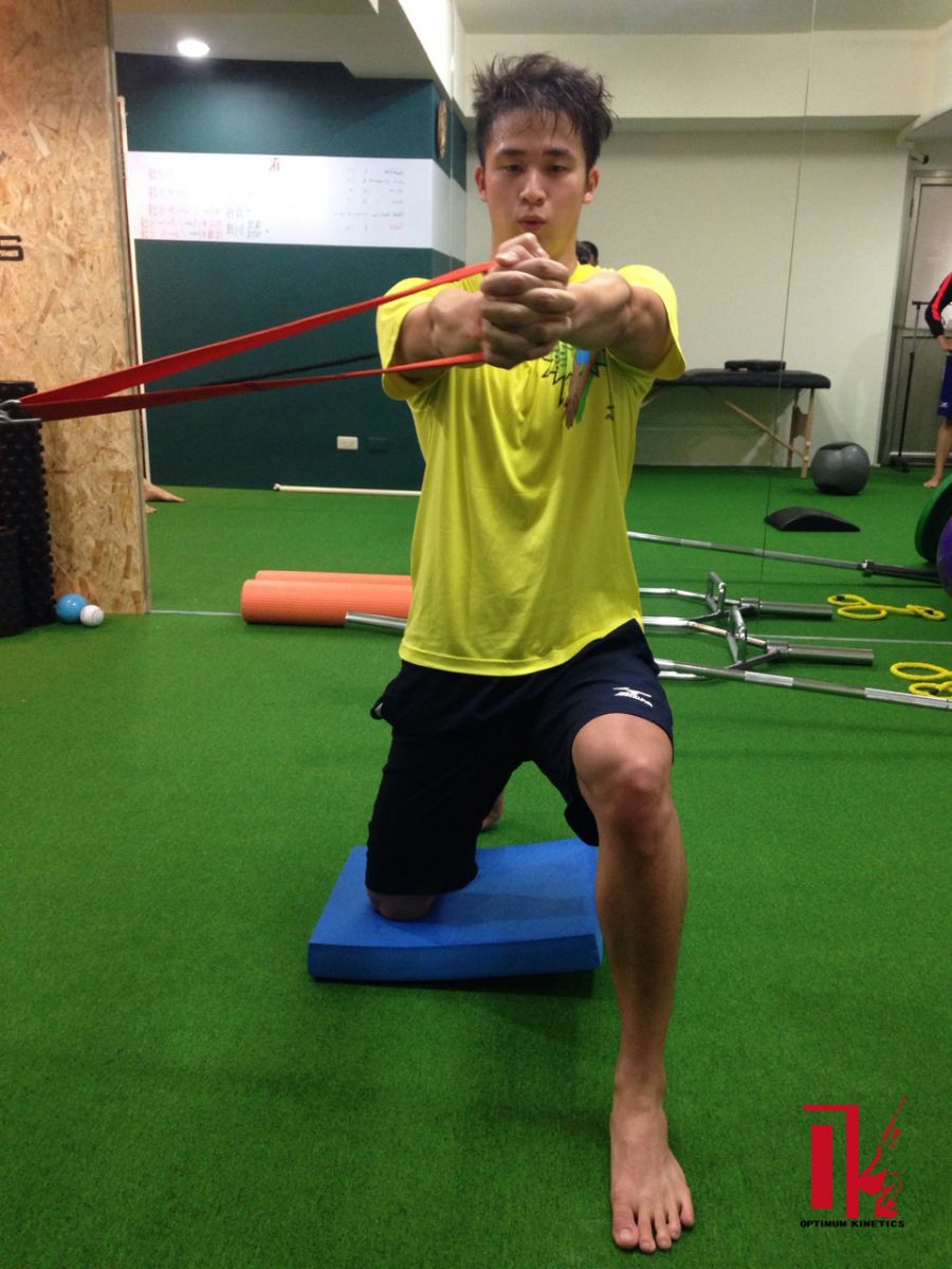 圖四、半跪姿抗旋轉訓練,阻力來自左方胸口高度。