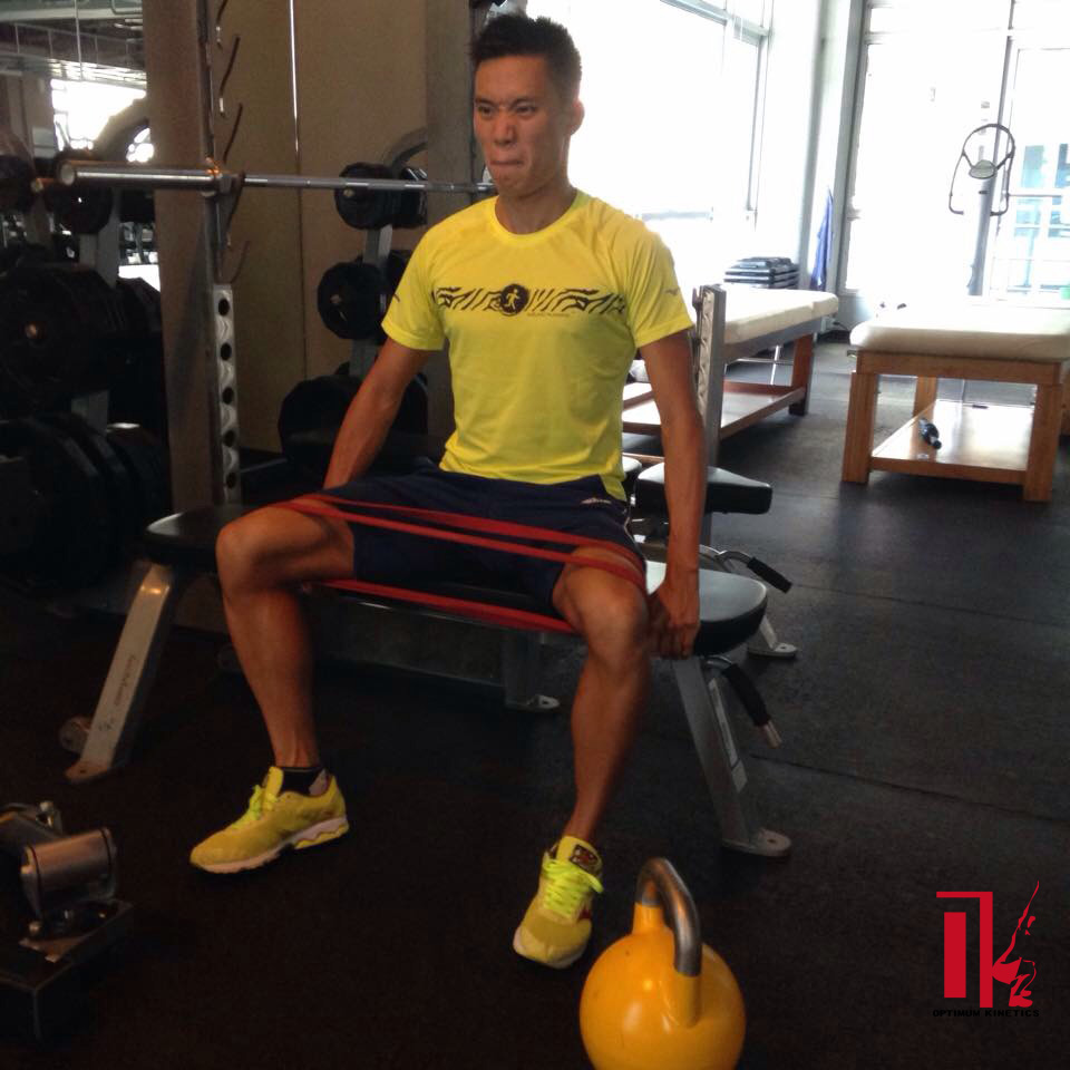 圖二、利用強力帶(super band)訓練臀部肌群。(a)站姿側跨步 (b)坐姿髖外展