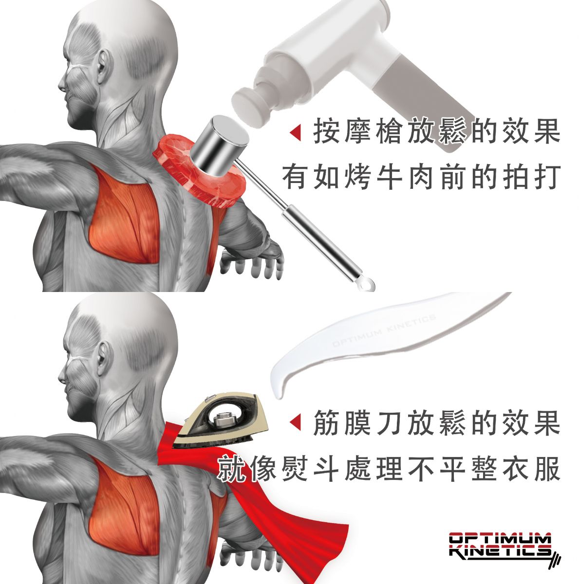 簡單來說,按摩槍放鬆的效果就像烤牛肉前的拍打,筋膜刀放鬆的效果就像以熨斗處理不平整的衣服(將沾黏的筋膜層順開)。