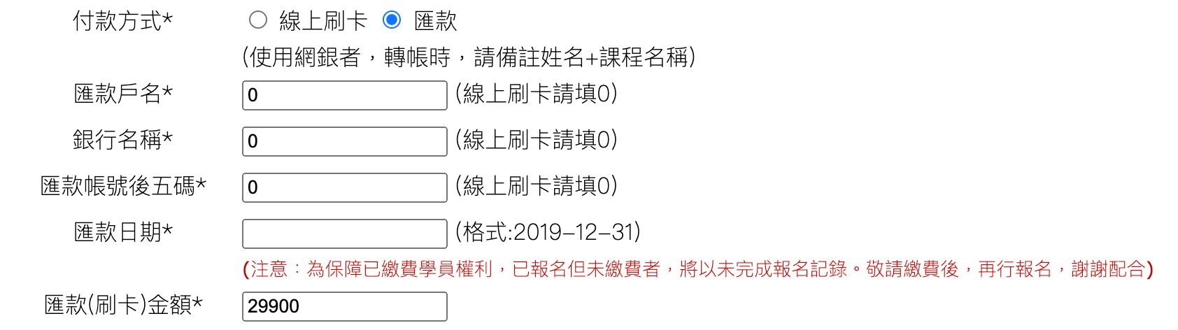 填寫報名表時,款項資訊填寫如下,無需再繳交任何費用。
