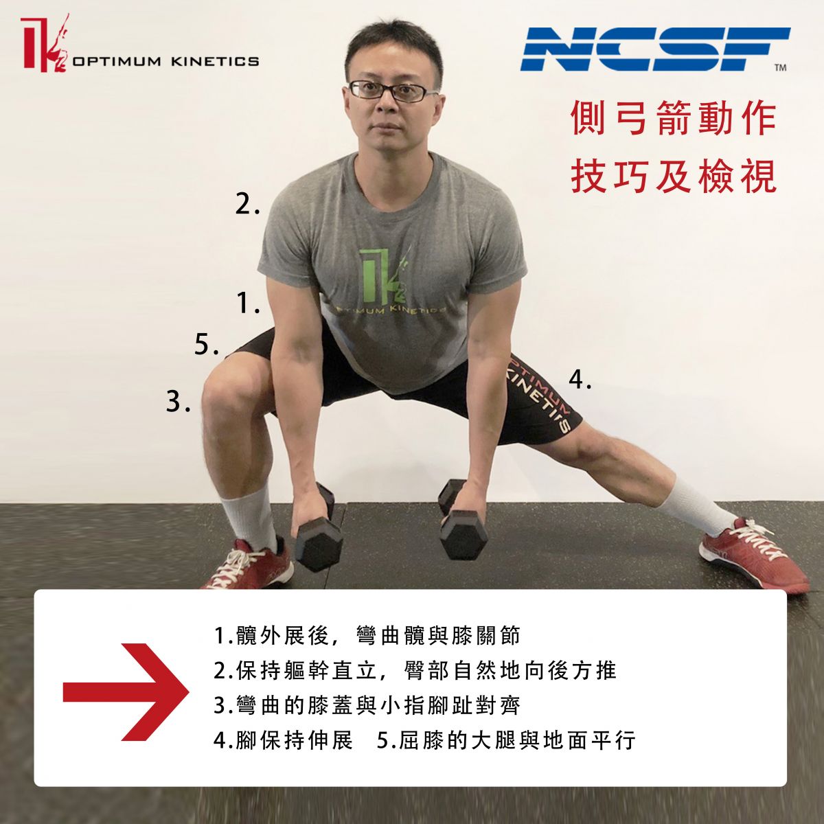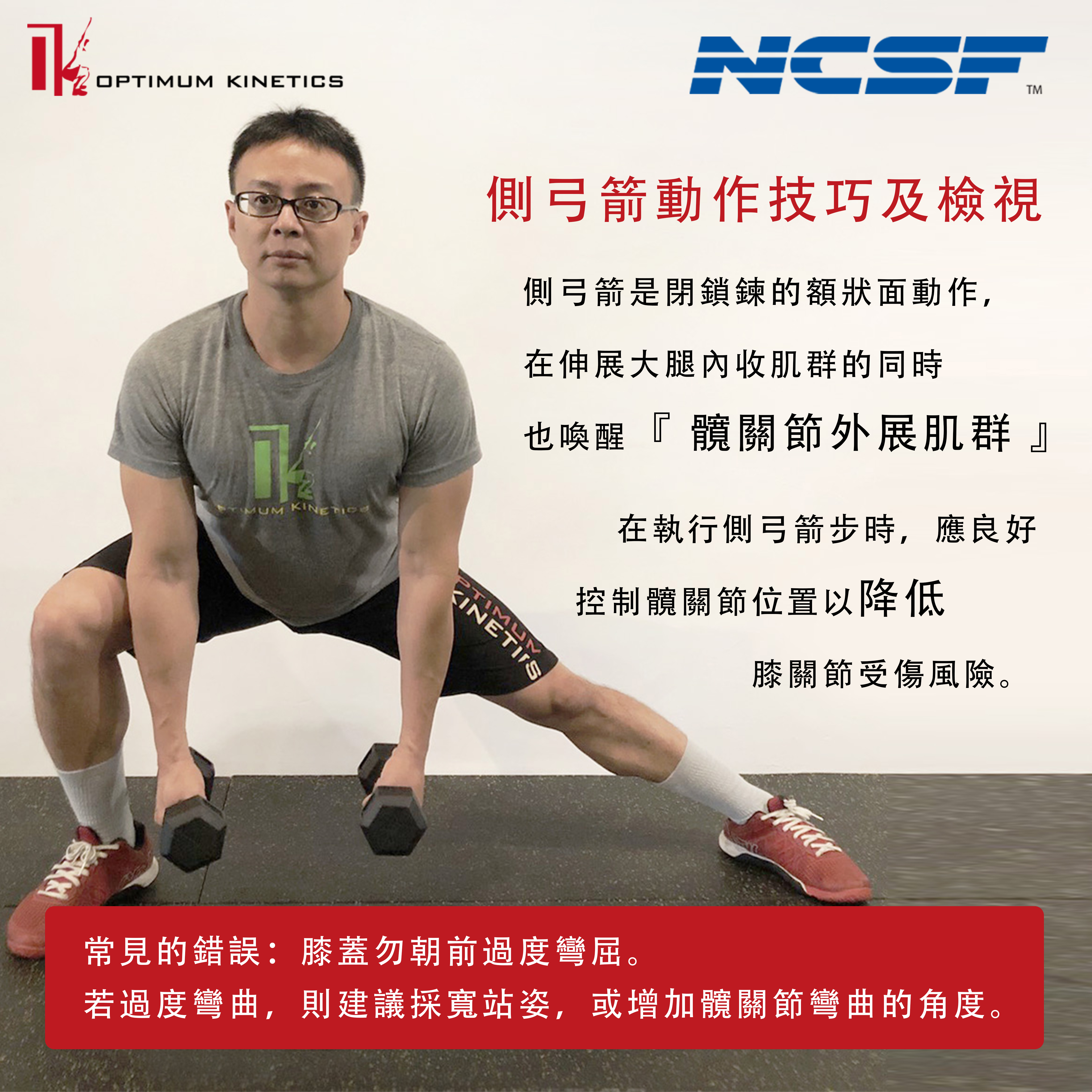 側弓箭步 (Lateral Lunge) 是常見的額狀面訓練動作,執行時須注意髖關節正確的位置,當正面檢視側弓箭步動作時,如跨步腳的髖關節超過彎曲的膝蓋,表示站距太窄、髖關節太緊繃和體能偏差。